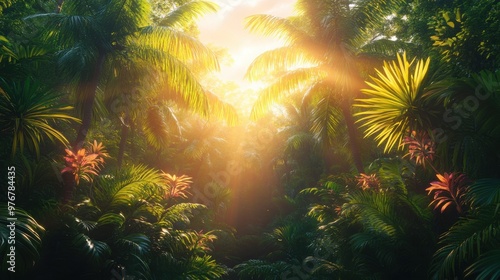 Explore the enchanting tropical landscape filled with vibrant flowers and lush greenery as the golden sunlight filters through the canopy at dawn
