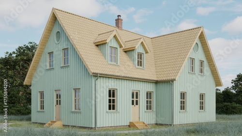 Explore this charming light green house with dormers and a tan roof in a serene outdoor setting today