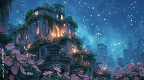 Exploring an Enchanted Castle Surrounded by Vibrant Flowers and Twinkling Lights in the Night Sky