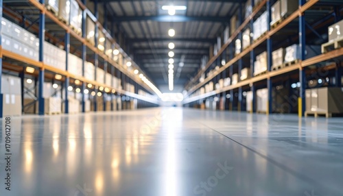 Exploring empty warehouse corridor with defocused perspective lines and soft lighting