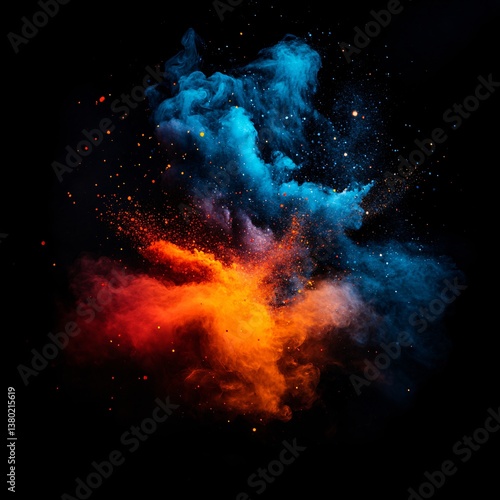 Explosion of colored smoke in dark space.