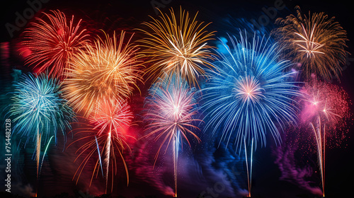 Explosions of multicolored fireworks against a dark backdrop