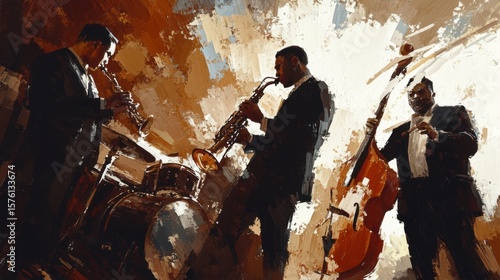 Expressive jazz trio performance captured in abstract brushstrokes and dynamic composition