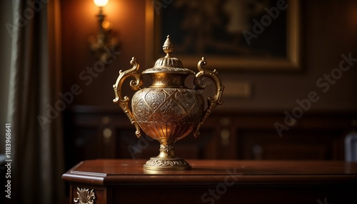 Exquisite golden antique vase with intricate patterns and curved handles.Elegance. History. Timeless beauty.luxury interior, antique decor, vintage collection, elegant home, museum display, decorative