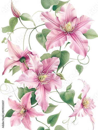Exquisite Pink Clematis Vine with Twisting Tendrils Blooming in a Lush Botanical Garden