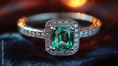 Exquisite silver ring with an emerald cut gemstone and a pav band placed on a dark velvet background for an upscale luxurious look