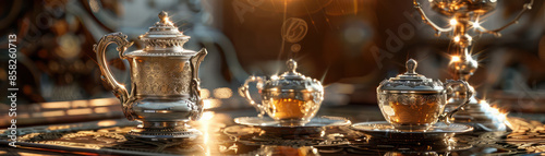 Exquisite Vintage Teaware Set in Elegant Gold and Silver, Perfectly Positioned on a Reflective Table with Warm Ambient Lighting Creating a Classical and Luxurious Atmosphere
