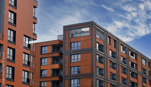 Exterior of modern houses in new area of the city. Architectural detail of windows, balconies. Real estate, residential apartment and office building architecture
