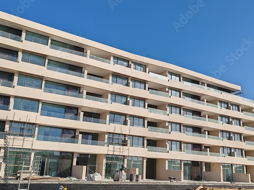 Exterior View Of Multi Story Building With Cream Color Modern Design. Top Floor Highrise Building With Balcony Black Window Glass And Blue Sky Background. Residential Commercial Complex Building view.