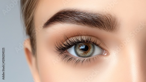 Extreme close-up macro shot of a woman's well-defined brown eyebrow, where a miniature blond cosmetologist in a beige spa uniform stands on a small white wooden ladder, precisely dyeing the