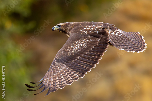 Extremely close view of a red-tailed hawk flying, seen in the wild in North California