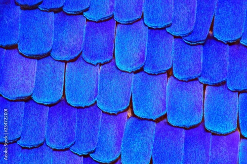 Extremely detailed image of a Morpho Rhetenor Cacica butterfly wing. This image is taken at 30x magnification with a microscope objective.