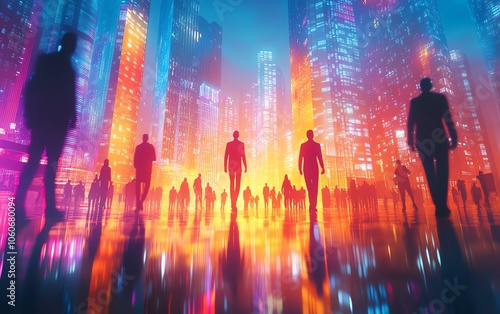 Eyecatching 3D visualization of diverse business silhouettes in motion in front of a brightly lit cityscape, symbolizing progress, diversity, and modern business