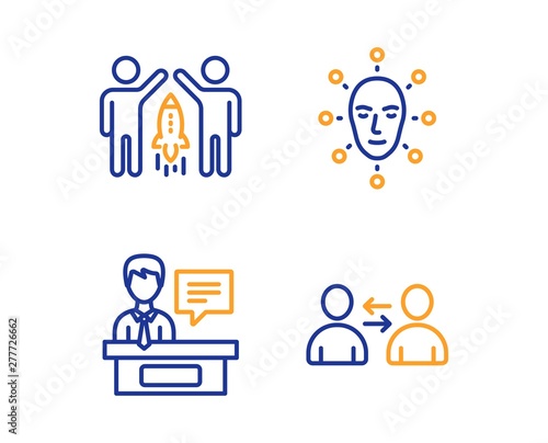 Face biometrics, Exhibitors and Partnership icons simple set. Communication sign. Facial recognition, Information desk, Business startup. Users talking. People set. Linear face biometrics icon