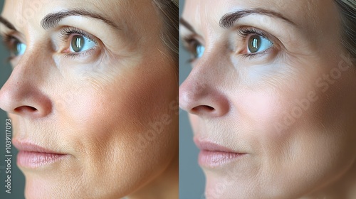 Facial rejuvenation timeline, with detailed images showing sagging skin and wrinkles before a facelift and the tightened, smooth result after surgery