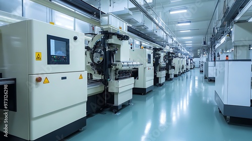Factory floor with advanced technology, machinery in use, and clear detail, with excellent lighting and sharpness, giving a modern and clean impression