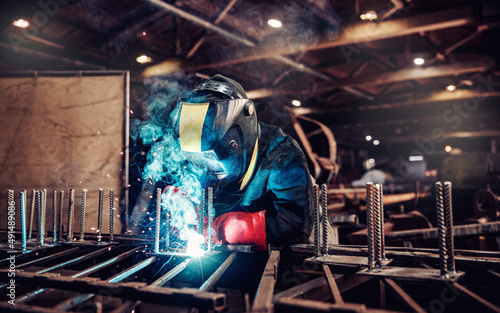 Factory industrial weld worker in workplace with spark. Professional welder erecting metal steel