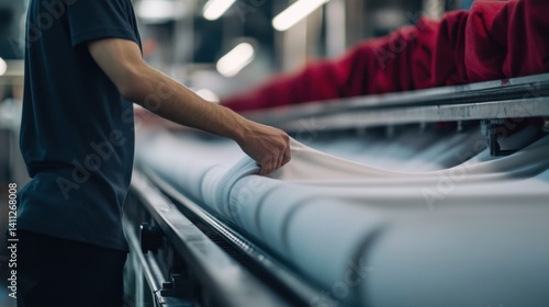 Factory worker checking the quality of textiles in a manufacturing plant. Featuring attention to detail and inspection