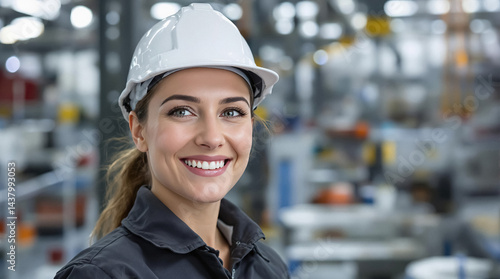 Factory worker in protective gear smiling woman wearing hard hat in industrial workplace