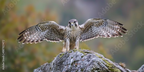 Falcon is in natural habitat. Peregrine Falcon bird of prey sitting on a rock or log with nature background. Arabian pet bird.