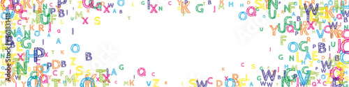 Falling letters of English language. Bright handdrawn flying words of Latin alphabet. Foreign languages study concept. Wonderful back to school banner on white background.