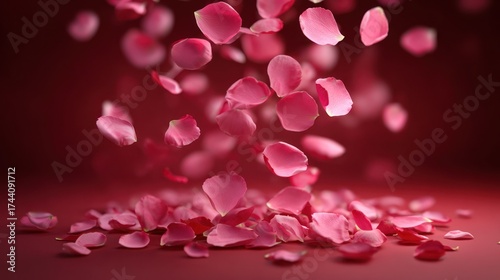 Falling pink petals against a deep red background for romantic visual concepts