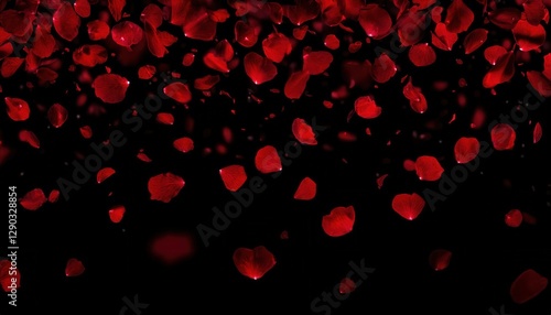 falling red rose petals and blooming roses on black background, romantic floral composition for valentine's day design