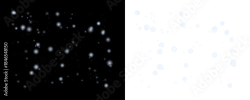 Falling snow particles overlay effect on black and transparent background, abstract winter holiday bokeh lights