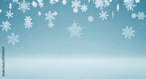 Falling snowflakes on a light blue background create a festive winter scene perfect for holiday cards and seasonal designs with copy space