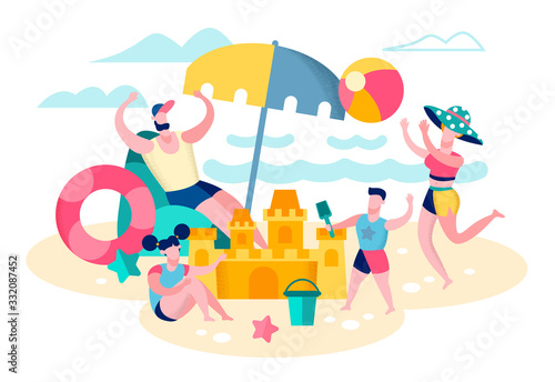 Family Entertainment on Beach During Summer Vacation on Tropical Resort Seashore Flat Vector Concept. Happy Father and Mother Making Sand Castle, Playing Inflatable Ball with Children Illustration