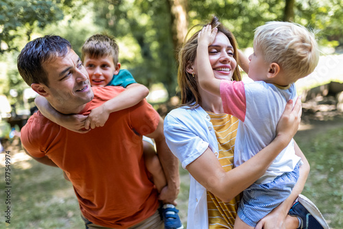 Family of four bonding in the park. Mother and father hugging with their sons.