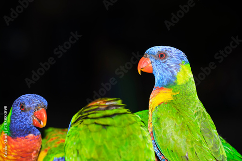 Family of wild rainbow lorikeets feeding with black background in portrait style image and lots of detail