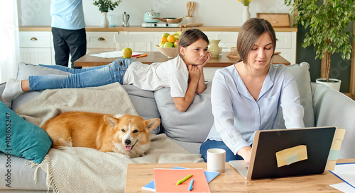 Family on Social Distancing During Quarantine Isolation Due to Coronavirus, Mother Tries to Work Remotely, Daughter Interferes with Work, Husband is Busy in the Kitchen
