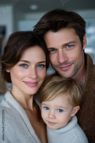 Family portrait in a cozy indoor setting with happy smiles