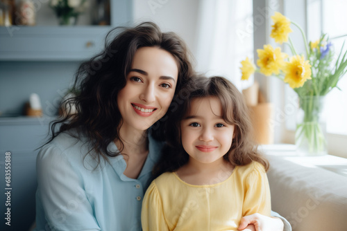 Family portrait of attractive brunette mother and daughter on the couch. mother's day