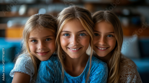 Family Portrait: Sisterhood Bond of Three Smiling Blonde Girls with Blue Eyes, Innocence and Joy, Child Wellbeing Concept