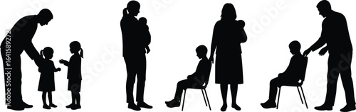 Family silhouettes with parents and children, mother holding baby, father interacting with kids, parent-child bonding, family love, home life, parenting care