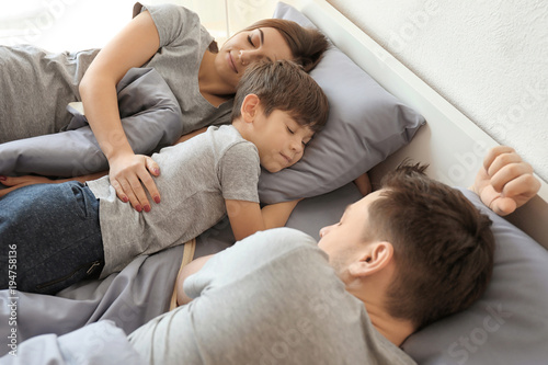 Family sleeping in bed at home