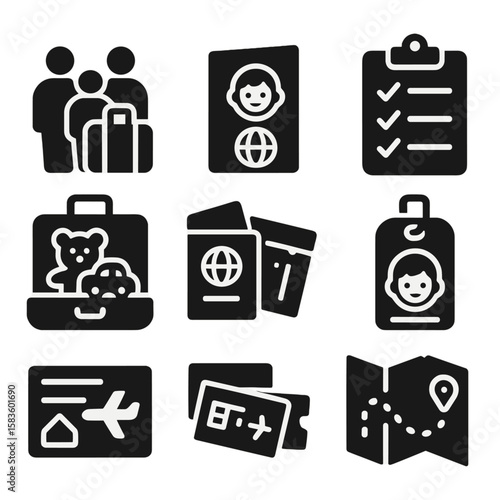 Family Travel Essentials. Solid style icons of family travel prep: family suitcase, child passport, travel checklist, packing toys