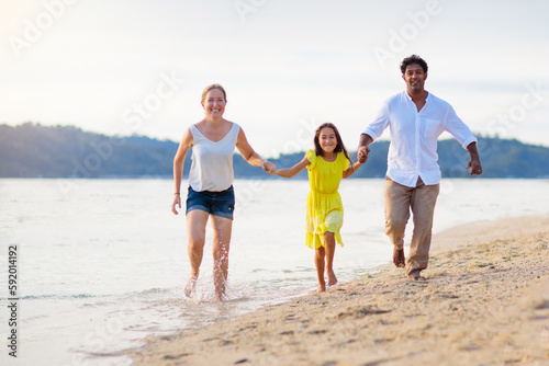 Family walking on tropical beach.