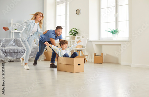 Family with child celebrating relocation to a new home, happily pushing son around in a moving box. This playful moment marks the excitement from real estate and joy of settling in together.