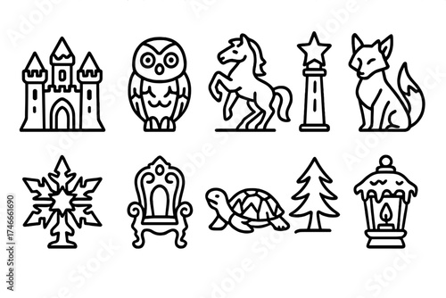Fantasy and fairy tale outline icon set. magic, mythical creatures, woodland icons