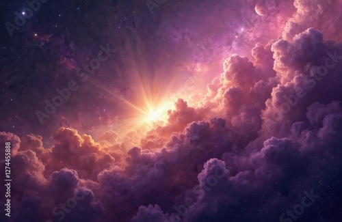Fantasy galaxy background with bright shining sun above violet pink clouds. Nebula and starfield in deep cosmos. Shining way with horizon element. Generative AI illustration with stardust.