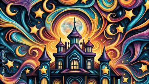 Fantasy temple with glowing stars and moon in colorful abstract night sky illustration
