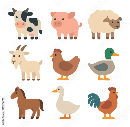 Farm Animal Icons. Flat icon set of farm animals: cow, pig, sheep, goat, chicken, duck, horse, goose, rooster.