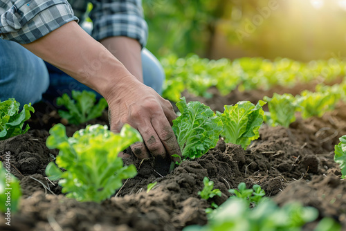 Farmer hands gently press young lettuce seedlings into the soil, plants are growing in the dirt.