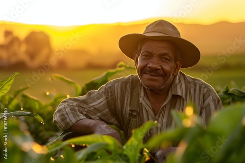 Farmer in Traditional Attire Working in Lush Green Field at Sunrise