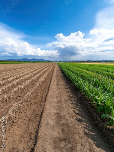 Farmers cultivate lush fields under a vast blue sky with rolling clouds for optimal crop growth