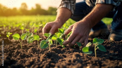 Farmer's Hand Tending to Young Plants