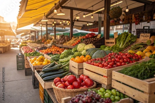 Farmer's market photography, fresh vegetables and fruits, natural lighting, for use in cooking and health blogs.